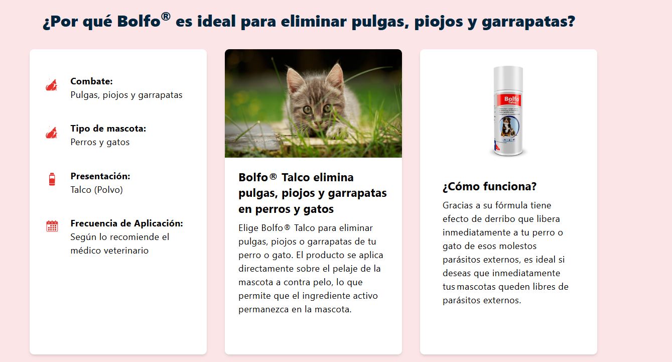 Bolfo® Polvo está indicado para el tratamiento y control de ectoparásitos en perros y gatos, incluyendo: