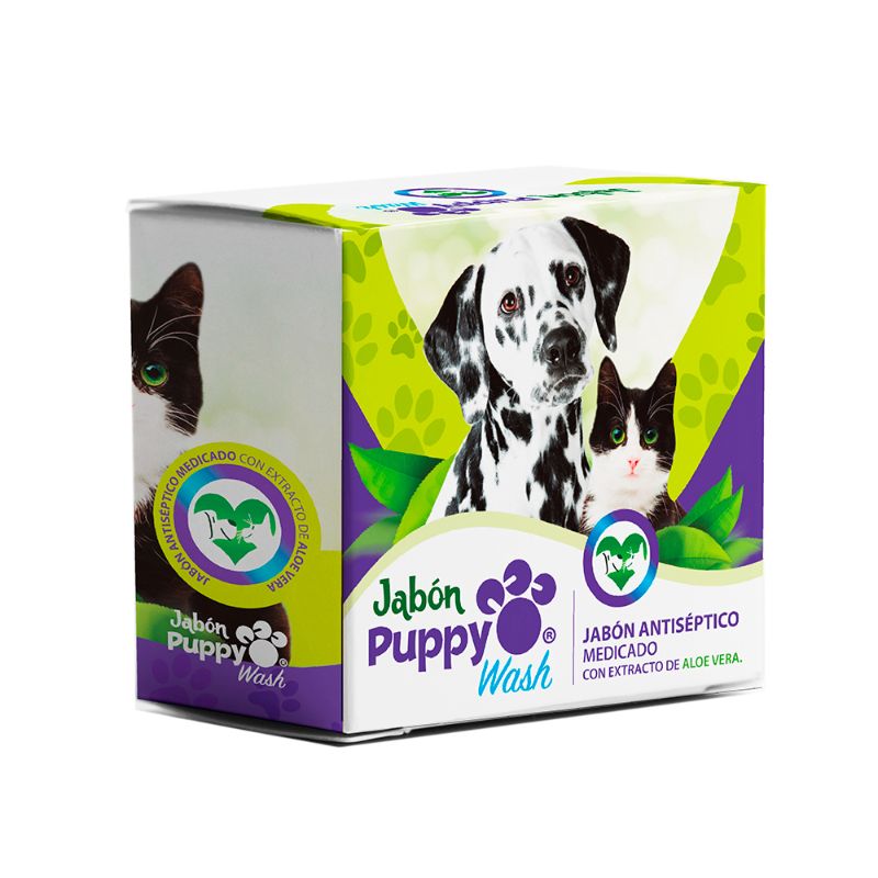 puppy wash jabón antiséptico, clorhexidina mascotas Colombia, tratamiento dermatitis perros gatos, jabón desinfectante veterinario, aloe vera jabón cutáneo animales, infecciones fúngicas piel mascotas, barra jabón 90 gramos ICA 10904-MV, producto veterinario piel sensible, higiene terapéutica mascotas, tienda virtual salud dermatológica animal.