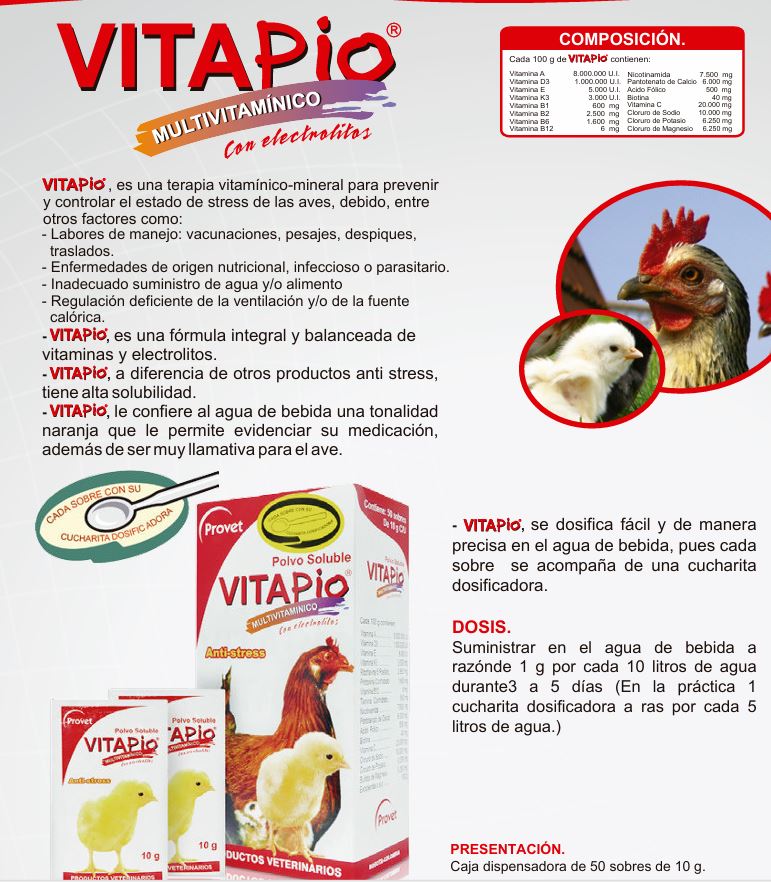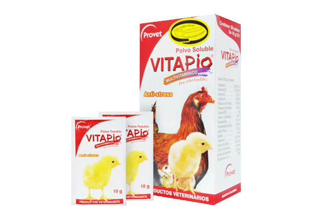 Vitapio es un suplemento integral y balanceado de vitaminas y electrolitos, diseñado para prevenir y controlar el estrés en aves causado por diversas condiciones adversas.